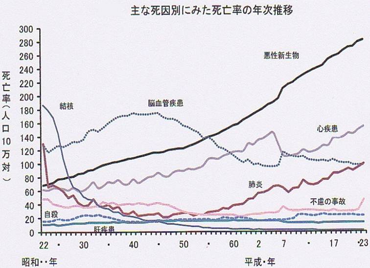 平成22年まで第3位だった脳血管疾患は決して減ったのではなく、むしろ数的には増加しています。それよりさらに増加したのが肺炎で、その順位が逆転したのです。脳血管疾患が発症してもそれが直接原因で亡くなる方は増加しなくなったのは事実でしょう。そのかわり以前に脳血管疾患にかかったことのある方が歳をとられて、肺炎をおこして亡くなるという例がかなり増加したのではないかと思います。