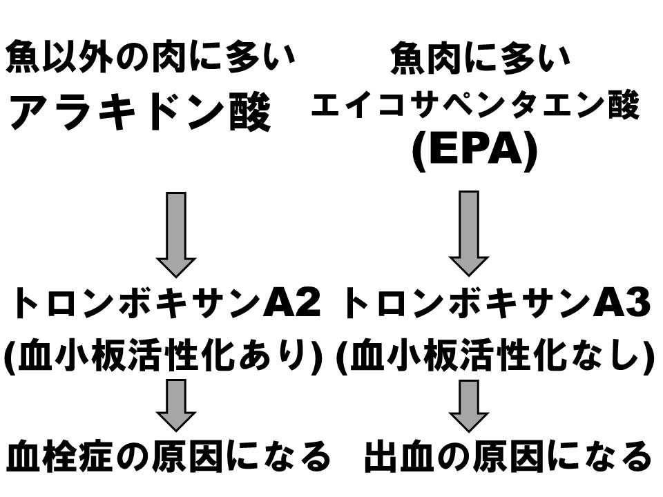 現在、エイコサペンタエン酸(EPA)を製剤とした抗血栓薬が作られています。この薬の作用の一部は代謝産物がトロンボキサンA3であって、トロンボキサンA2ではないことも関係しているのです。そして青魚は体に良いと言われているのも、その主成分が人の血小板ではトロンボキサンA3を合成するので血栓症がおこりにくいことが関与しています。しかし少しぐらい青魚を食べていても、その人の体中のアラキドン酸がEPAに置き換わってしまうことは考えられないので、出血を心配するほどのものではないとご理解下さい。