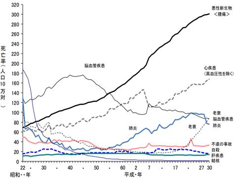 上の図は厚生労働省が公表している平成30年(2018年)人口動態統計月報年計(概数)の概況から引用した主な死因別にみた死亡率(人口10万対)の年次推移です。1年前のデータですが、これが今月発表された最新のもので、このページの5月2日付け(統計では肺炎による死亡率が減った?)より新しいものです。前回の死亡順位は、第1位はがん(悪性新生物)、2位は心疾患、3位は脳卒中(脳血管疾患)、4位に老衰、5位が肺炎でしたが、最新版では老衰が肺炎抜いて初めて第3位になっています。老衰は最近上昇し続けている傾向にあり、今回脳血管疾患を抜いて第3位になったわけです。グラフでは老衰と脳血管障害はほとんど差がないように見えます。実数でも3位の老衰は10万9606人、4位の脳血管疾患10万8165人と差はごくわずかですが、老衰が脳血管疾患を上回っていました。