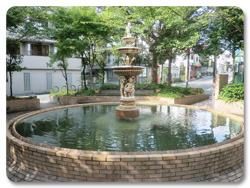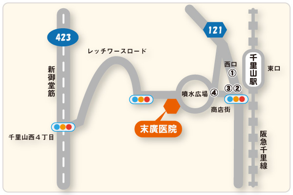新御堂筋をお車でお越しの方は、千里山西、緑地公園の交差点を千里山方面へ進んで下さい。右カーブの坂を上がった所に信号がありますが直進して坂を下った突きあたりが噴水広場です。末廣医院はその右角にあります。 |