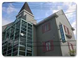 阪急千里山駅前から、信号を渡って商店街のゆるやかな坂を上がったところに噴水広場があり、その向こう側の左角です。 |